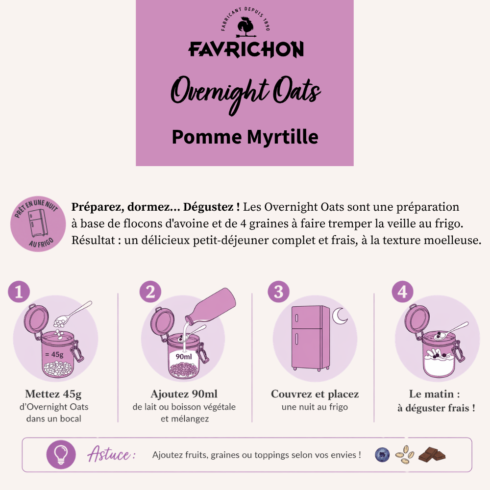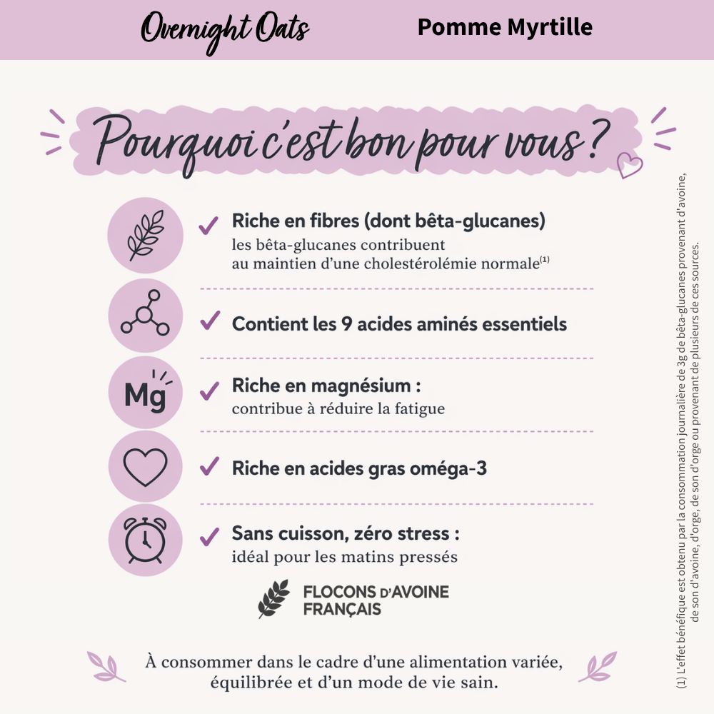 Ce mélange à base de flocons d’avoine français, de pommes et de myrtilles offre une texture moelleuse et un goût fruité légèrement acidulé.